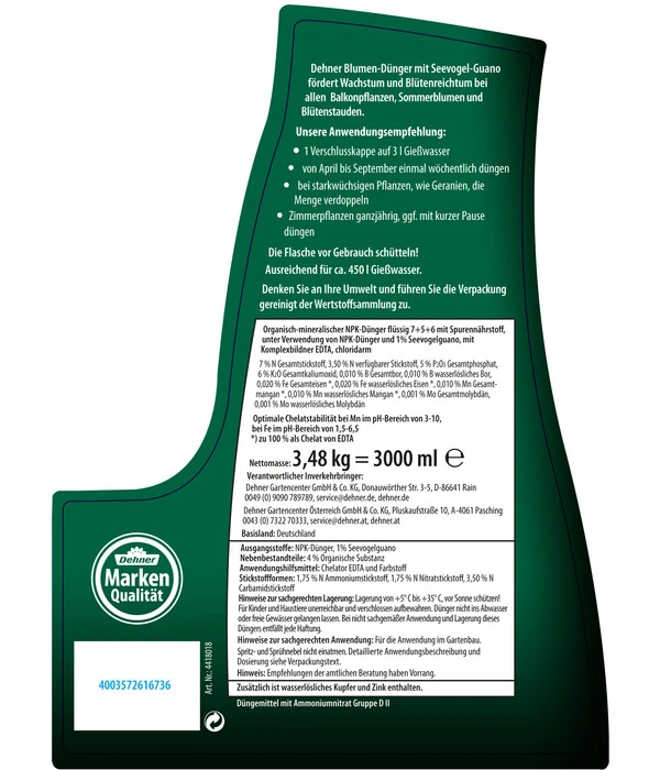Prächtiger Balkonschmuck in Form von bunten Geranien, die Vielfalt an zauberhaften Sommerblumen und wunderbar blühende Stauden sind ein Blickfang und geben Gärten und Häusern die besondere Aufmerksamkeit. Pflanzen brauchen für ihr prächtiges Erscheinen Unterstützung in Form von Nährstoffen. Um in ihrer vollen Blütenpracht zu strahlen, wollen Blumen und Sträucher mit ausreichend Nährstoffen versorgt sein. Für ein gesundes Wachstum und eine außergewöhnliche Blüte der Pflanzen sorgt der flüssige Dehner Blumen-Dünger mit Guano-Extrakt. Er fördert Blütenreichtum bei allen Pflanzen und stärkt die Pflanze von Grund auf. Dieser Blumen-Dünger kann auch bei Zimmerpflanzen verwendet werden und fördert deren Wachstum.