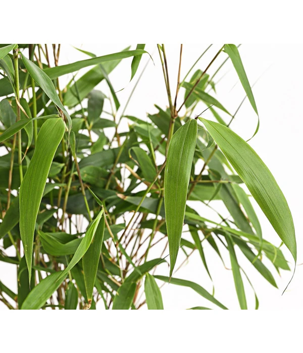 Der Hohe Gartenbambus ist eine imposante Gartenpflanze, die auch im Winter durch ihre immergrünen Blätter besticht. Dieser Bambus bildet keine Ausläufer und wächst aufrecht zu wunderschön dichten und kompakten Horsten heran, die eine Höhe von 4 – 5 m erreichen können. Die dünnen überhängenden Halme des Schirmbambus sind in jungen Jahren zartgrün gefärbt und tendieren mit zunehmendem Alter ins Gelbliche. An ihnen wachsen dicht an dicht kleine, zartgrüne Blätter.