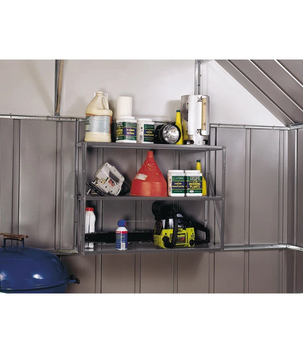 Das Spacemaker Regal ist das ideale Zubehör für Ihr neues Gerätehaus. Auf den Regalböden lassen sich Ihre kleineren Gartengeräte, Farben oder andere Utensilien optimal verstauen. So schaffen Sie praktischen und neuen Stauraum. Mit einer Tragkraft von 38 kg je Boden können Sie auch schwerere Gegenstände optimal und platzsparend unterbringen. Ein weiterer Pluspunkt ist die einfache und äußerst schnelle Montage. Bestellen Sie sich das Spacemaker Regal und schaffen Sie ohne viel Aufwand Ordnung in Ihrem Gerätehaus.